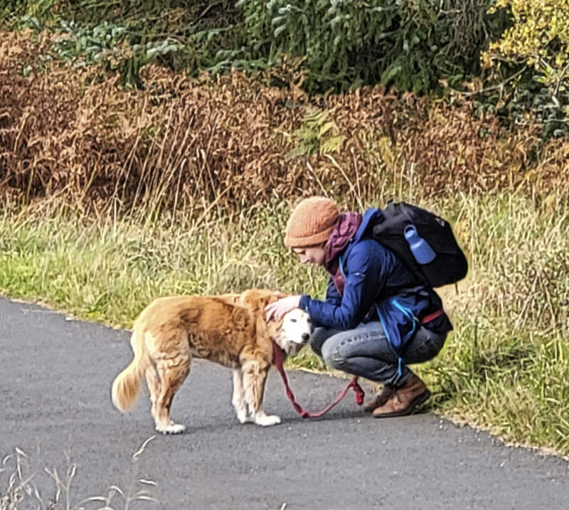 Katie Hood and Estel-the-dog, along Rob Roy Way, Killin, Scotland