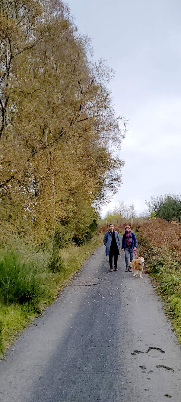 Hannah Menke (left), Katie Hood and Estel-the-dog, along Rob Roy Way, Killin, Scotland