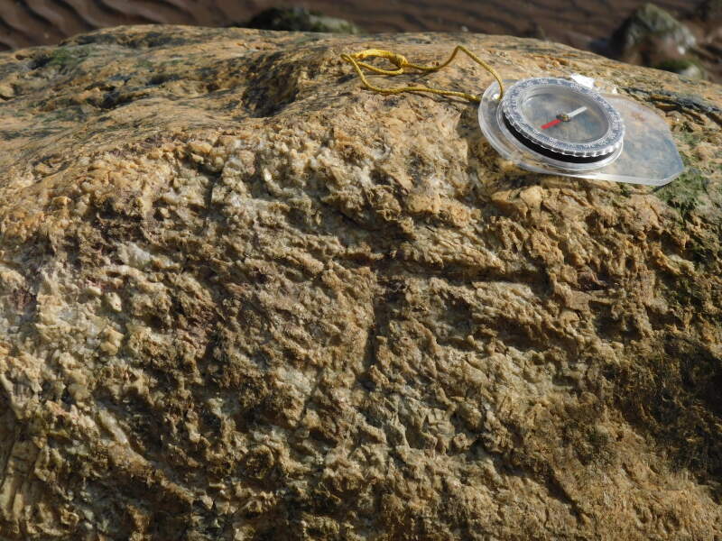 Detail of glacial boulder, beach at Mount Loretto Unique Area, Staten Island, New York