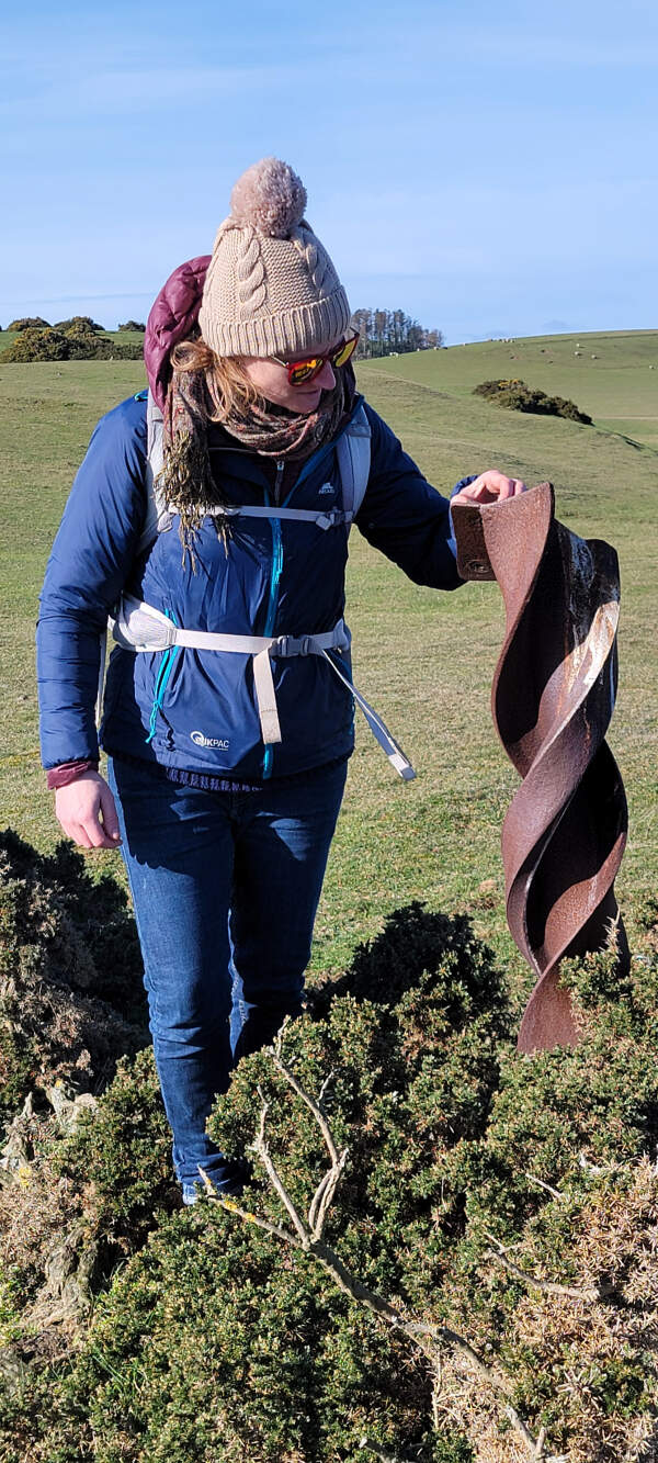 Katie Hood, by a trail marker along the Coastal Path