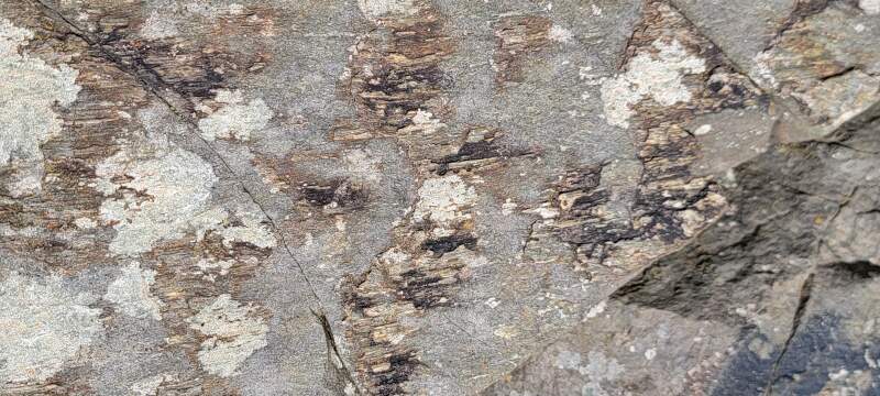 Slickenslides on a fault surface, by bridge to Fast Castle