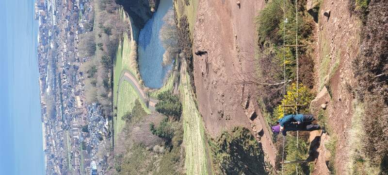 View towards Dunsapie Loch (lake) as seen from the trail to Arthur's Seat, Hollyrood Park, Edinburgh, Scotland