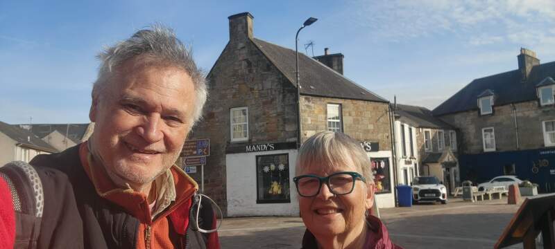 Me (Bill Menke, left) and Dallas Abbott, by Mandy's Store, Kinross, Scotland