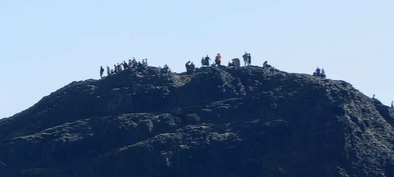 People atop Arthur's Seat, as seen from Salisbury Crags, Hollyrood Park, Edinburgh, Scotland