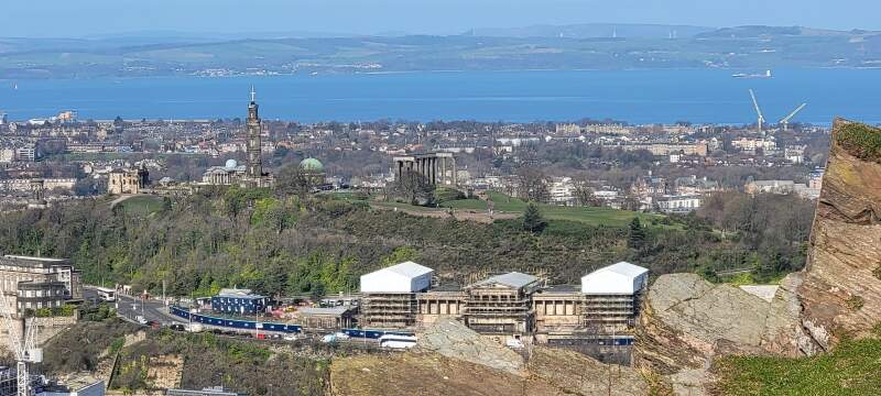 Calton Hill Park with Nelson Monument (tower) and the National Monument of Scotland (fake Parthenon), as seen from Salisbury Crags, Hollyrood Park, Edinburgh, Scotland