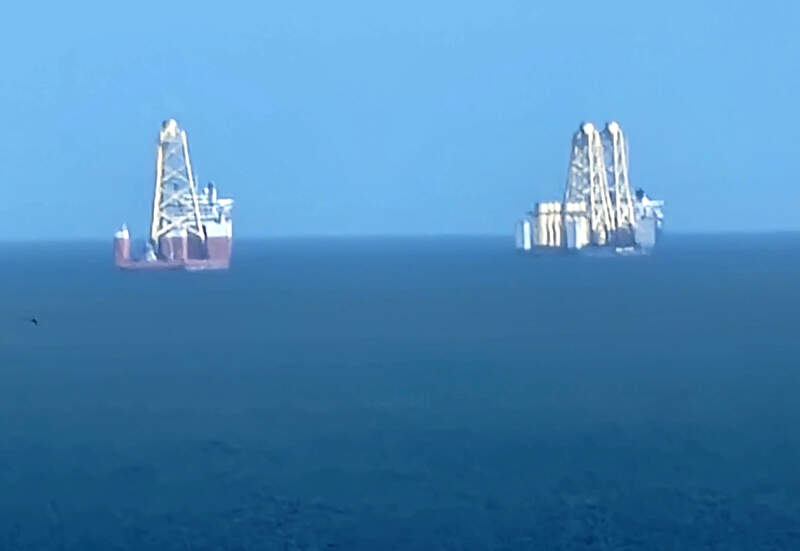 Ships in the Firth of Forth carring wind turbine platforms, as seen from the east flank of Salisbury Crags, Hollyrood Park, Edinburgh, Scotland