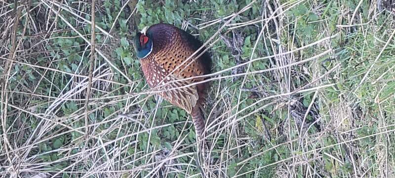 Pheasant, bushes beneath Salisbury Crags, Hollyrood Park, Edinburgh, Scotland