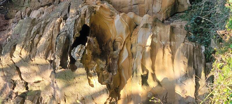 Cross-bedded sandstone, with erosional cavity, outcropping in the valley of the Dunglass Burn (stream), near Cockburnspath, Scotland