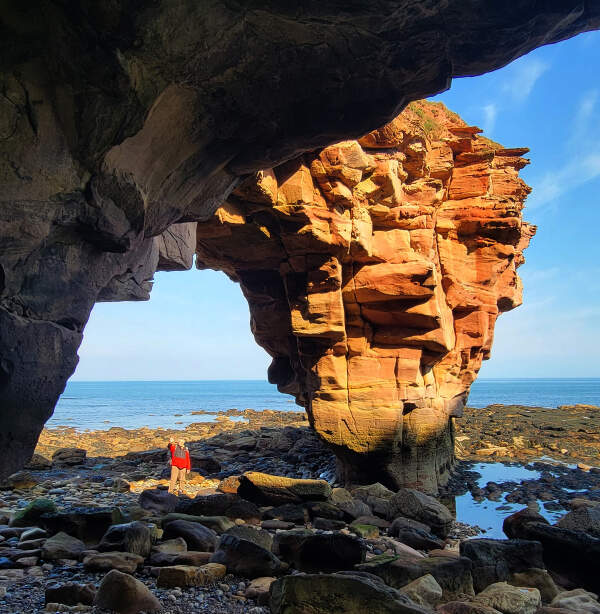 Me (Bill Menke) beneath the double sea arch, Dunglass Beach, near Cockburnspath, Scotland (Photo credit: Rowen)