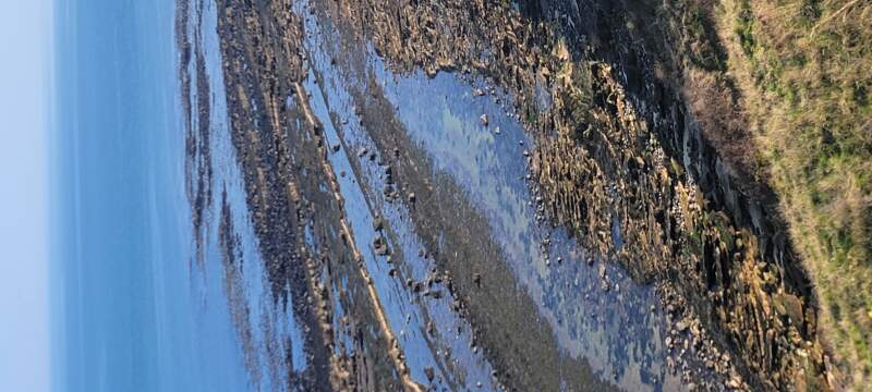 Sedimentary strata outcropping along the shore of the North Sea, as seen form the Southern Upland Way, near Cockburnspath, Scotland
