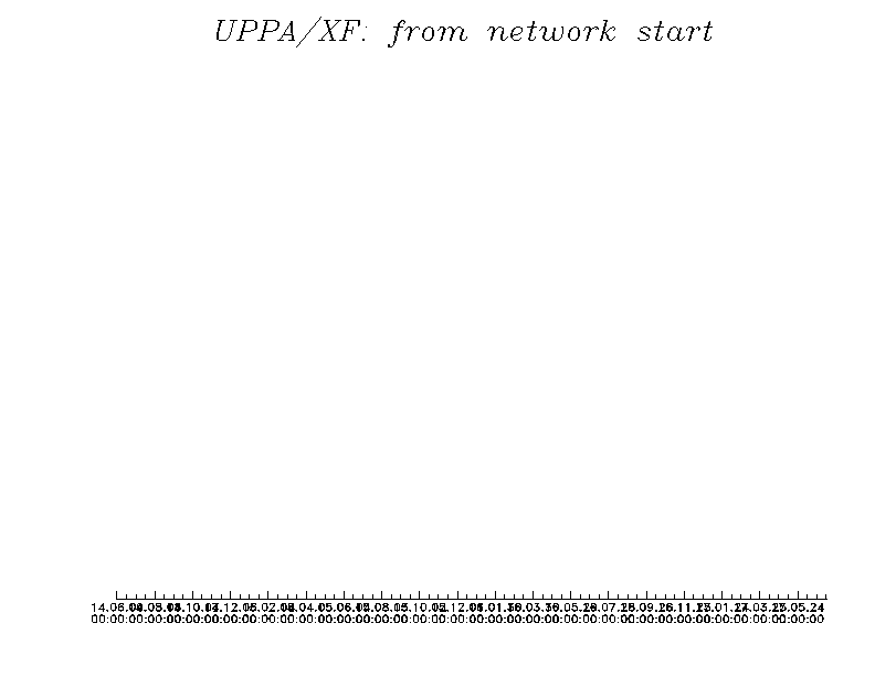 Project UPPA-GL Data HoldingsThe plots below show the extent of data acquired from the UPPA/XF network in near-real time for recent time periods. Data are transmitted by Iridium satellite link to the IRIS/PASSCAL Instrument Facility in Socorro, NM, and from there to the IRIS DMC in Seattle, WA, using standard internet protocols. We pull the data from the DMC to LDEO using the DMC's FDSN-standard web services. A colored bar indicates the presence of some data from any one of the channels we acquire through this route (LH* and BH*). The plots are updated once per hour. |