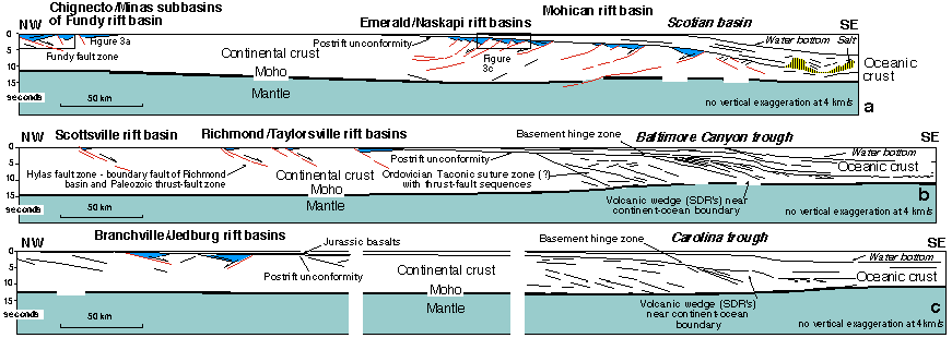 | Figure 2: Northwest-southeast regional cross sections through the passive margin of eastern North America. Sections show Paleozoic structures, early Mesozoic rift basins, and Mesozoic-Cenozoic postrift basins. Vertical axes are in two-way travel time. Section locations are shown in Figure 1. (a) Transect through southeastern Canada is based on seismic data from Keen et al. (1991a, b) and Withjack et al. (1995). Transect through the eastern United States is based on geologic data from Shaler and Woodworth (1899), Benson and Doyle (1988), and Olsen et al. (1989), and seismic data from Sheridan et al. (1993). Onshore geology was converted to two-way travel time assuming a velocity of 4000 m/s. (c) Transect through the southeastern United States is based on seismic data from Behrendt (1986), Austin et al. (1990), and Oh et al. (1995). Eastern U.S. and southeastern U.S. transects show massive volcanic wedges (SDR's) at continent-ocean boundary. [Modified from Withjack et al., 1998.] |