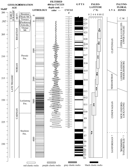 Figure 1: Time scale for the Late Triassic based on the NBCP cores. Adapted from Olsen and Kent (1999).
