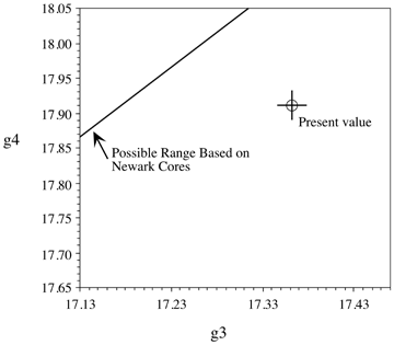 Figure 2: Range of possible g3 and g4 values based on the Newark cores and limited by the size of the chaotic zone as defined by Laskar (1990) for the last 200 million years and possible range of those values that satify the data from the NBCP cores (from Olsen and Kent, 1999a).