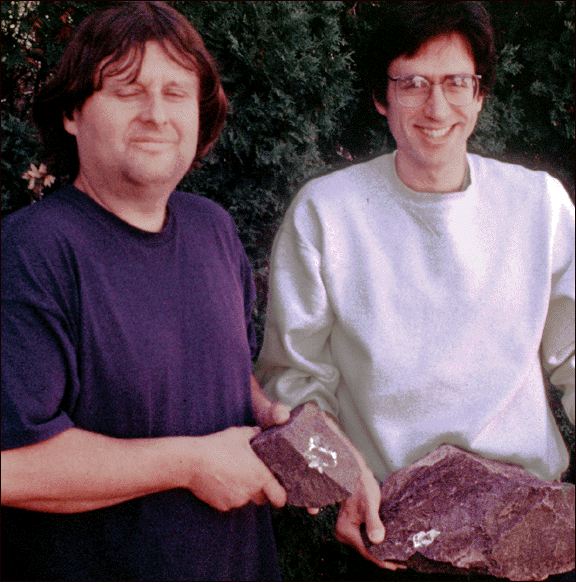 The discoverers of the skulls at Exeter, Mr. Brian Hartline (left) and Mike Szajna (right) from Mt. Penn, PA holding the two blocks of rocks containing the skulls of Hypsognathus (the white shapes). Check out their web site at