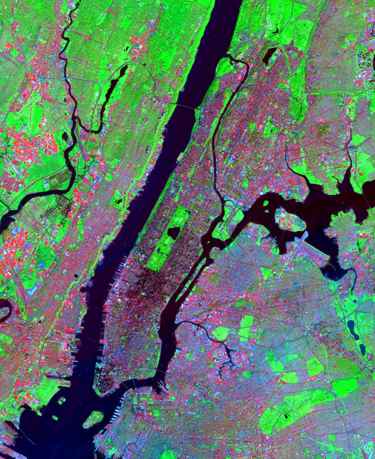 The image above is a false color composite combining surface temperature and vegetation abundance information derived from Landsat TM data acquired 2 October, 1999. Red indicates surface temperature, green indicates vegetation abundance and blue indicates visible brightness. Red and pink areas are characterized by higher surface temperatures and lower vegetation abundances. Green and yellow areas are characterized by higher vegetation abundances and lower surface temperatures. Blue and black areas have lower surface temperatures and little or no vegetation.